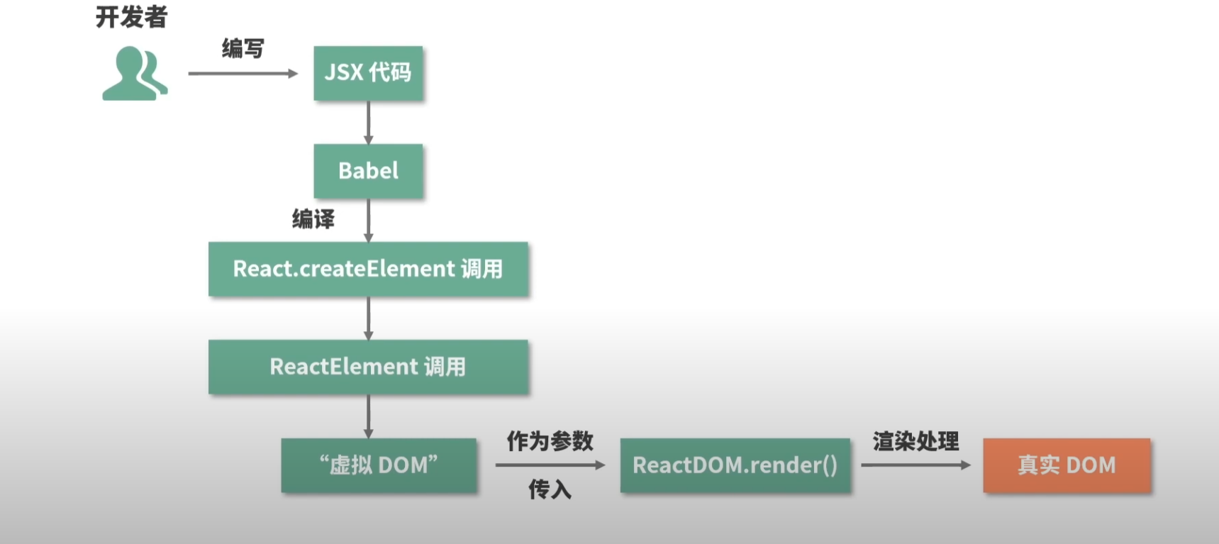 JavaScript 中夹杂着 HTML 的语句在其中,称之为jsx语法,它是对 JavaScript 语法的扩展,本质是React.createElement的语法糖。其中的React.createElement做的事情很清晰,他有三个参数type、config和children。顾名思义,分别代表节点类型如div、节点所有属性如className和节点的子节点。就是说以jsx文件代码为输入,编译生成虚拟dom,然后通过render方法生成真实的dom节点。